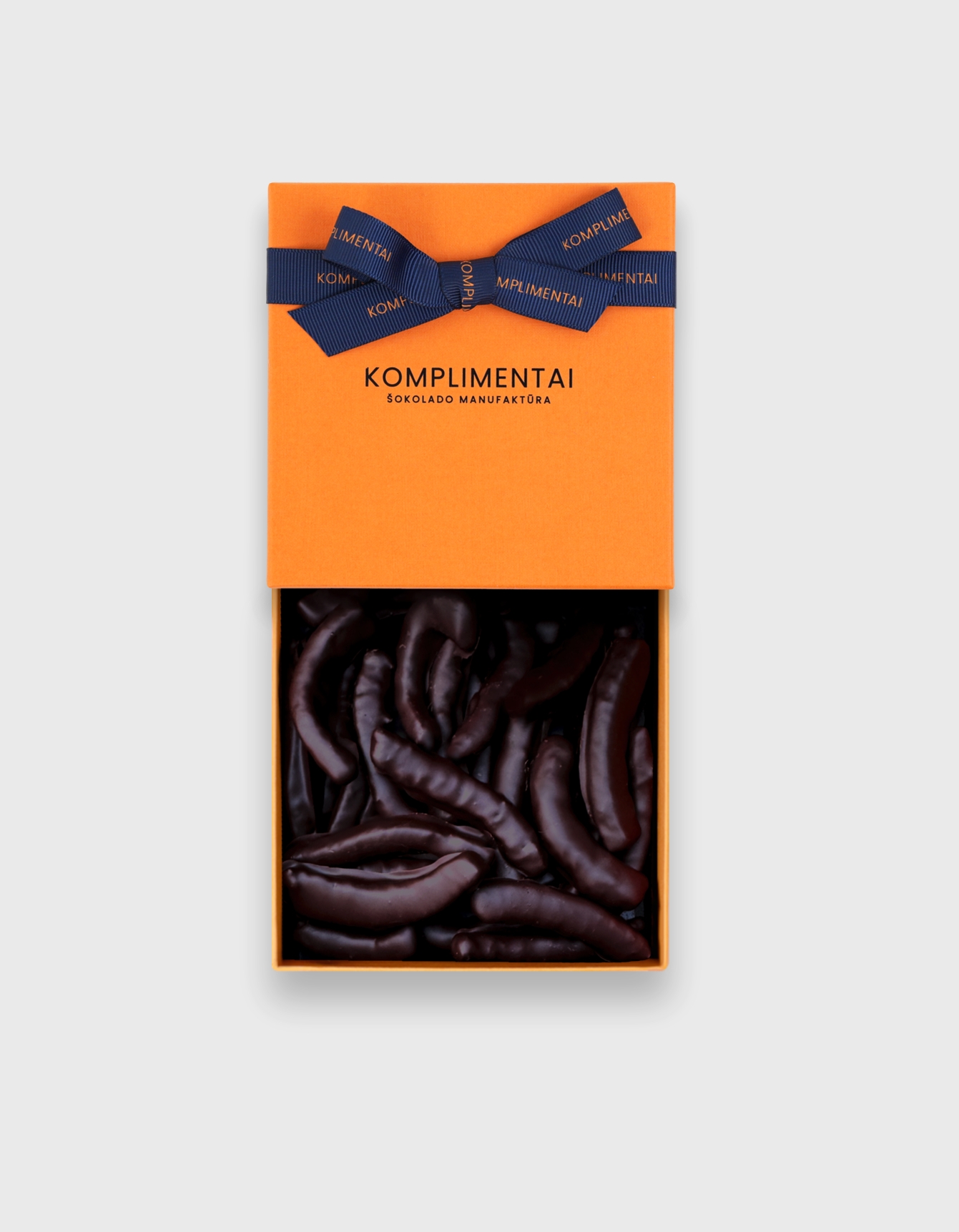 Apelsinų žievelės, glaistytos 70 % juoduoju šokoladu, išsiskiria gaivia citrusine nata ir sodria kakavos galia. Subtilus kontrastas dovanai ar kasdieniam pasilepinimui.
