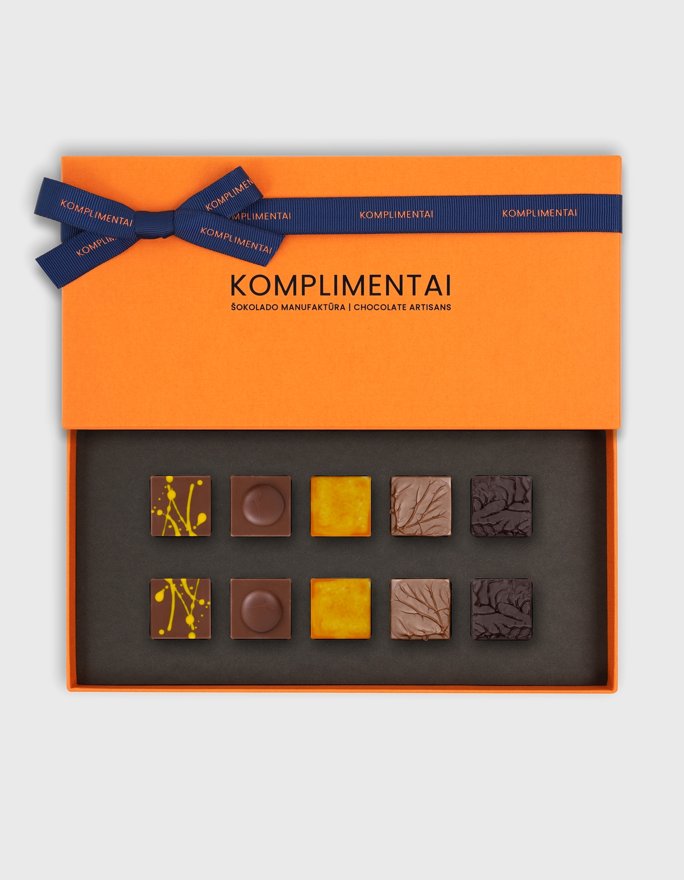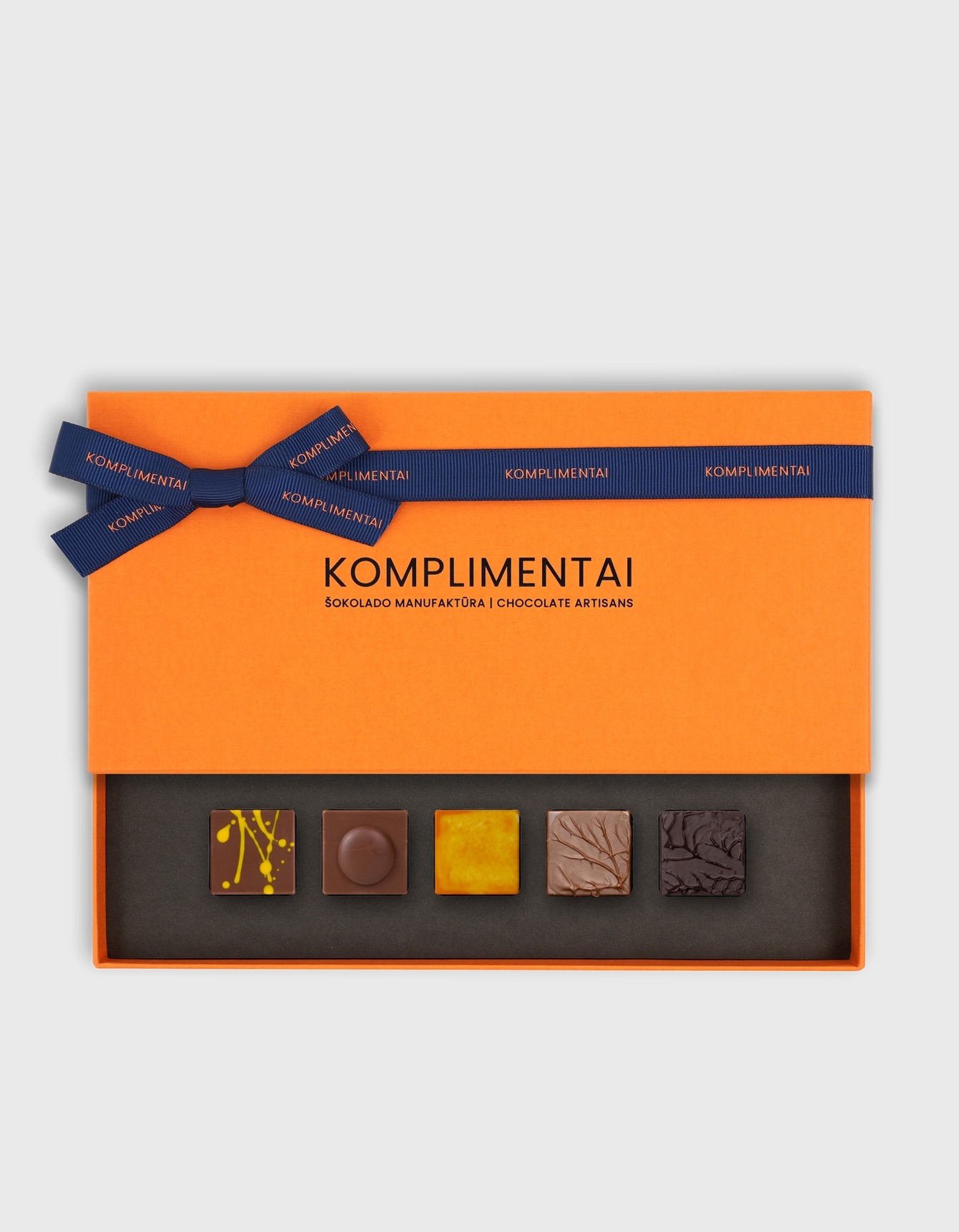 Pilnas ,,Komplimentai“ rankų darbo šokoladinių saldainių asortimentas. Asorti rinkinį sudaro juodojo, pieniško ir baltojo šokolado saldainiai, leidžiantys mėgautis skirtingais skoniais vienoje dėžutėje – puikus pasirinkimas, kai sunku išsirinkti vieną favoritą.